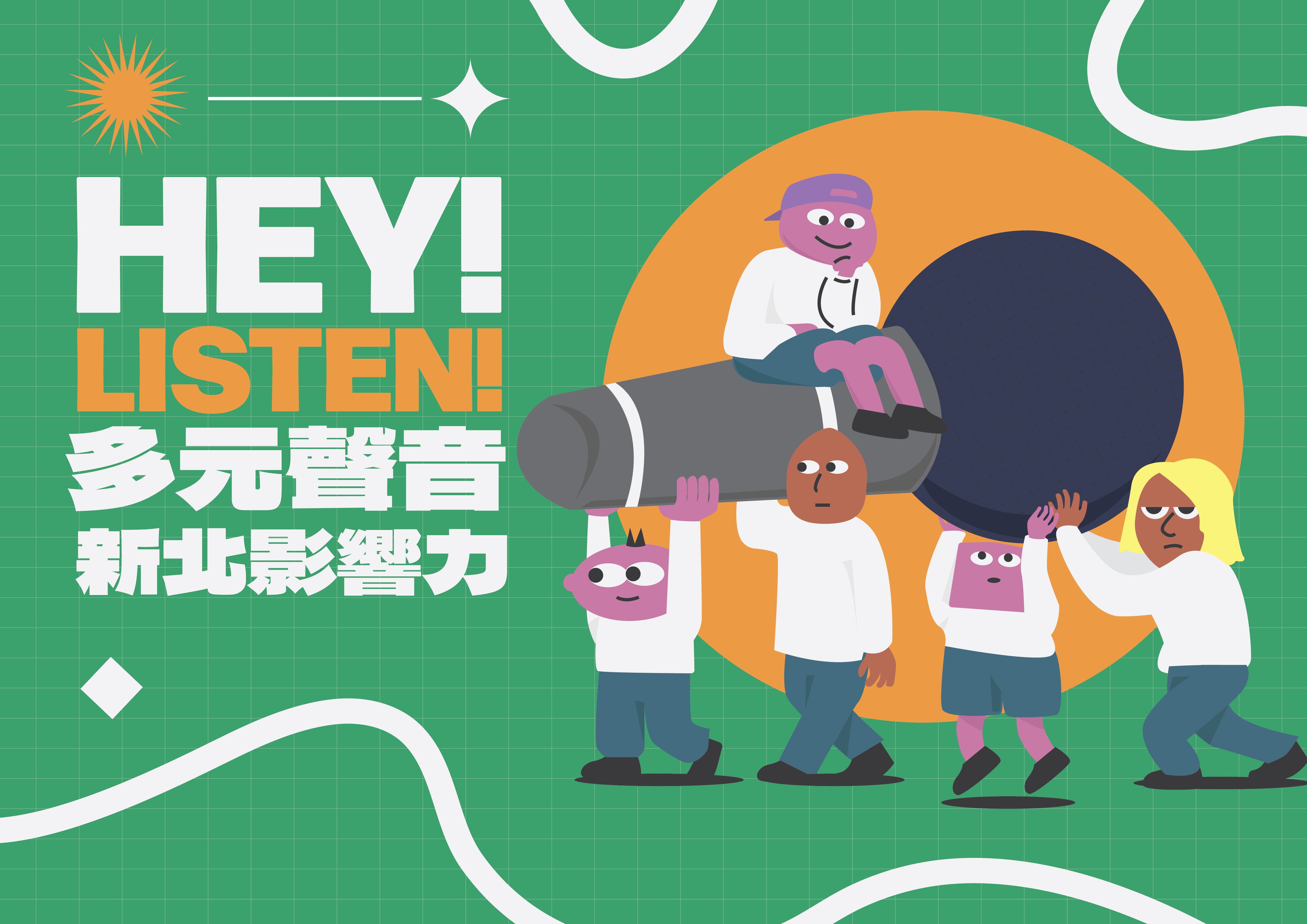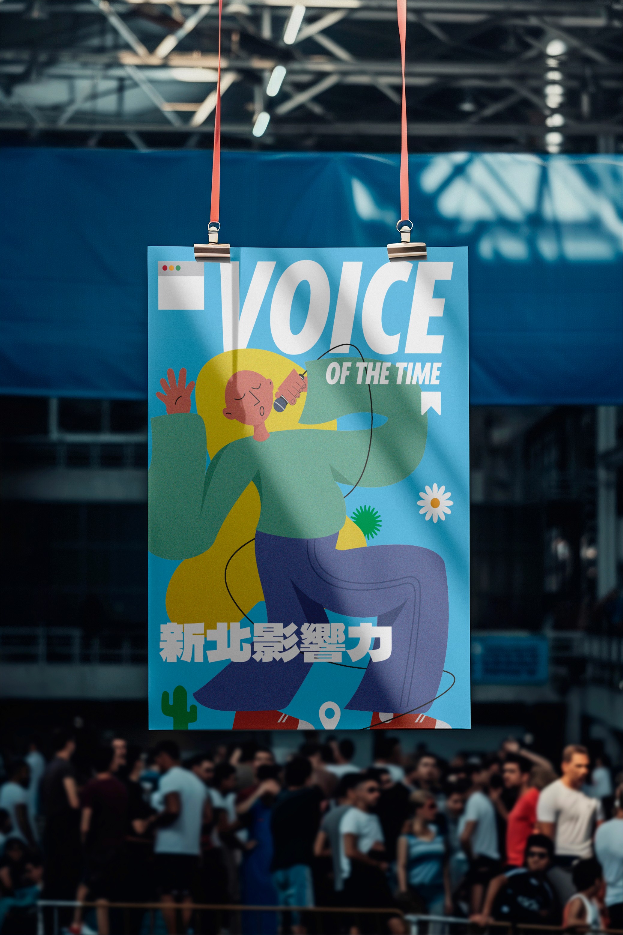 這是為新北市文化活動提案的設計案,主題圍繞「多元聲音與影響力」。主視覺以「眾人共同抬起麥克風」作為象徵,呈現出不同世代與族群的共鳴。