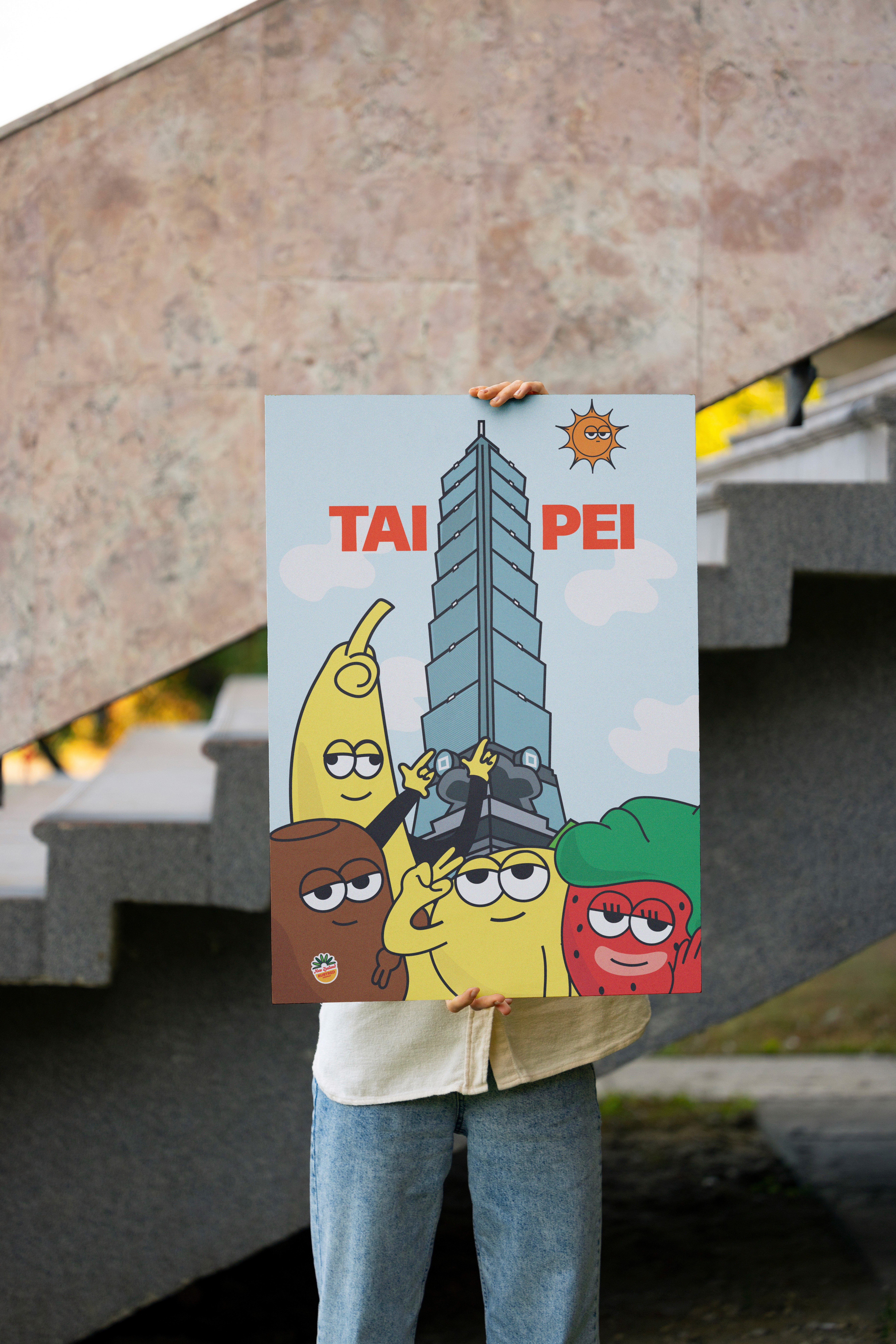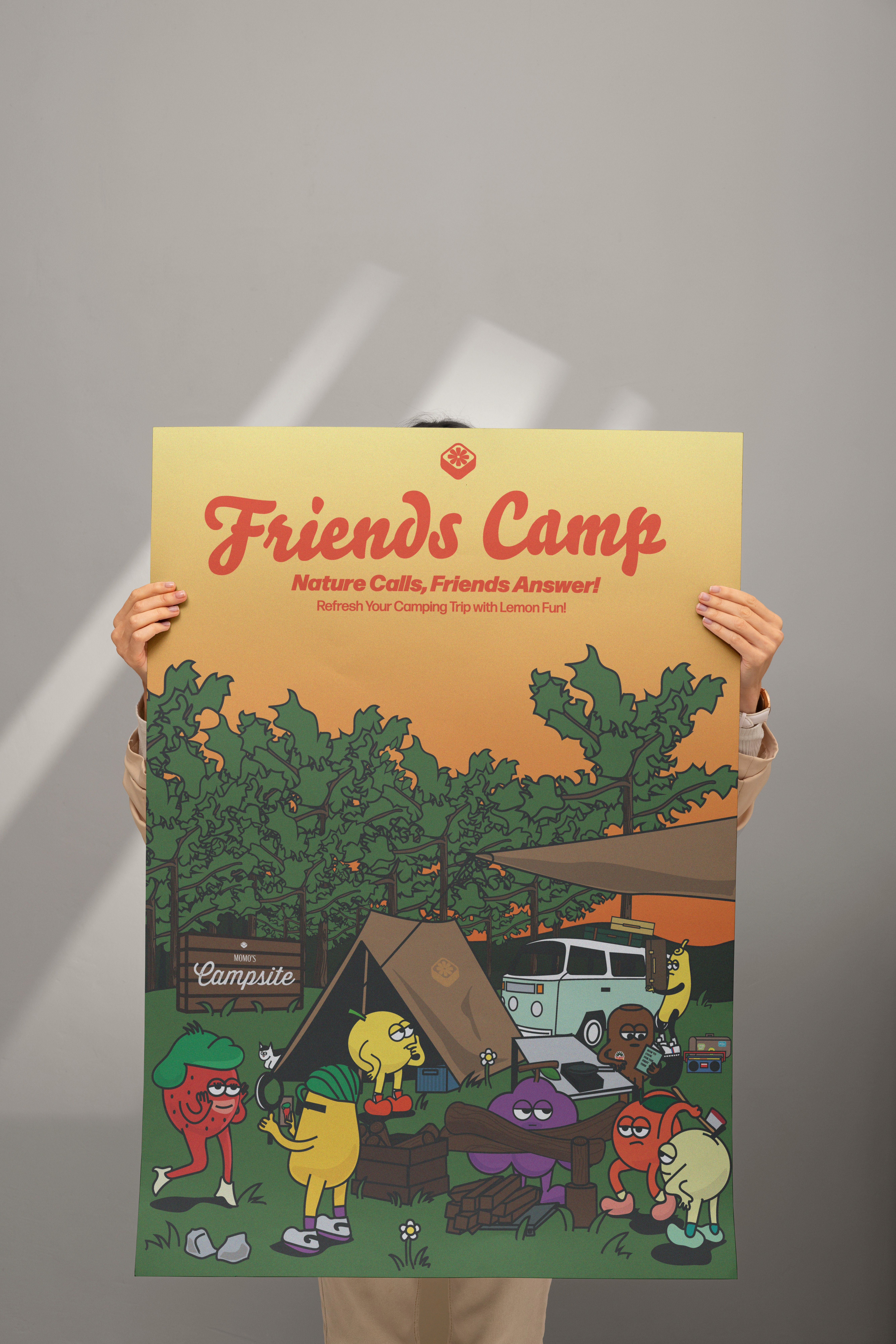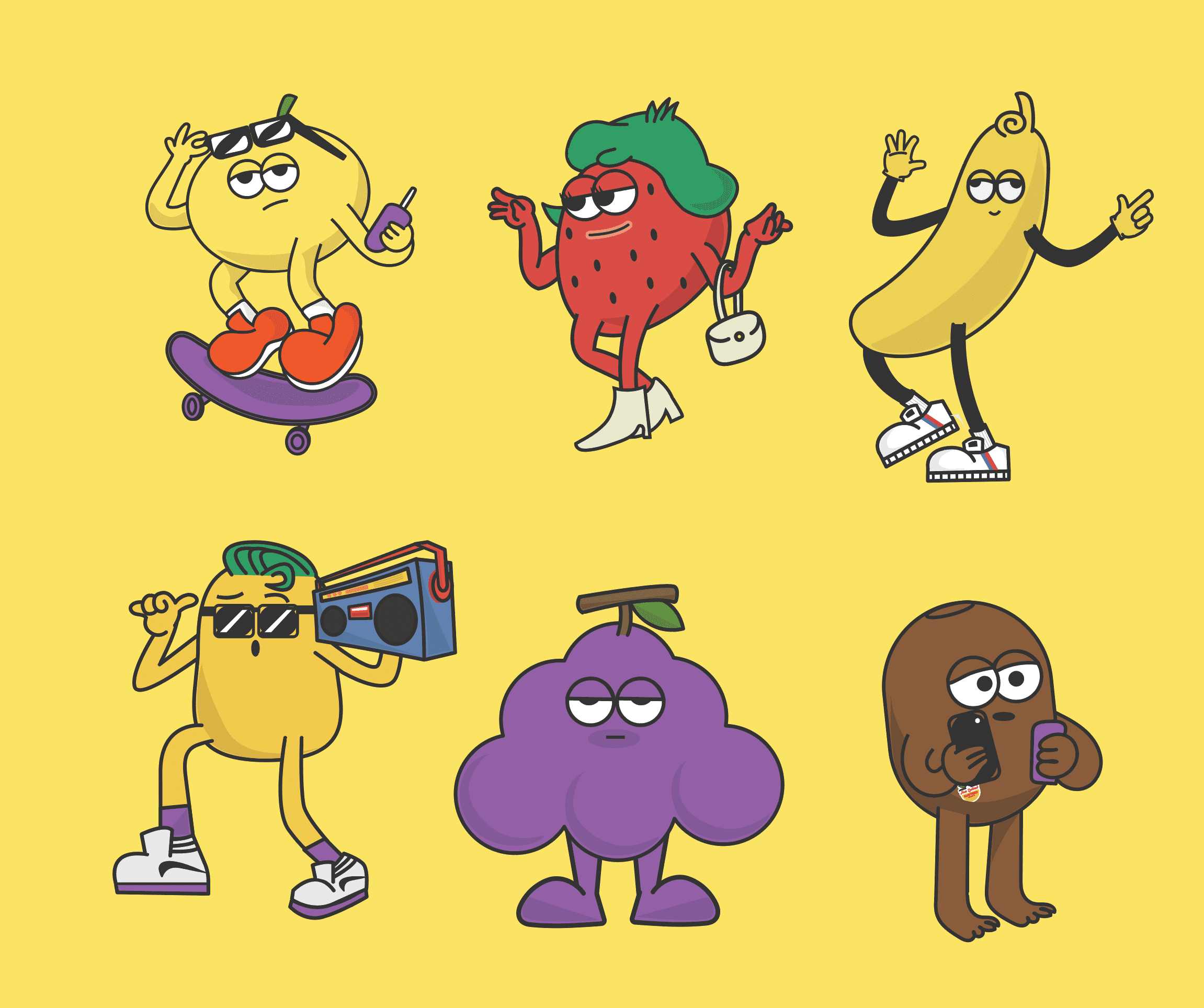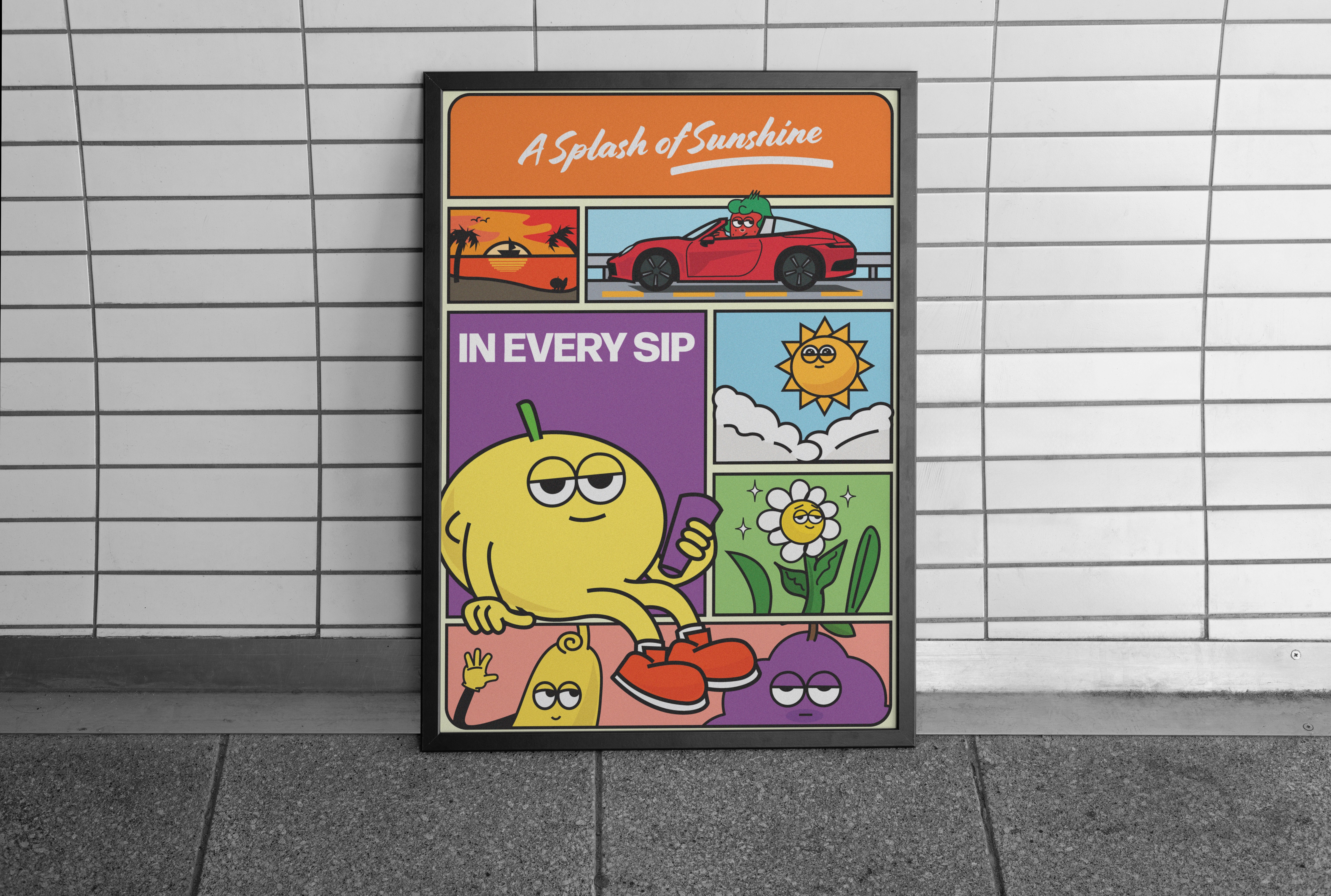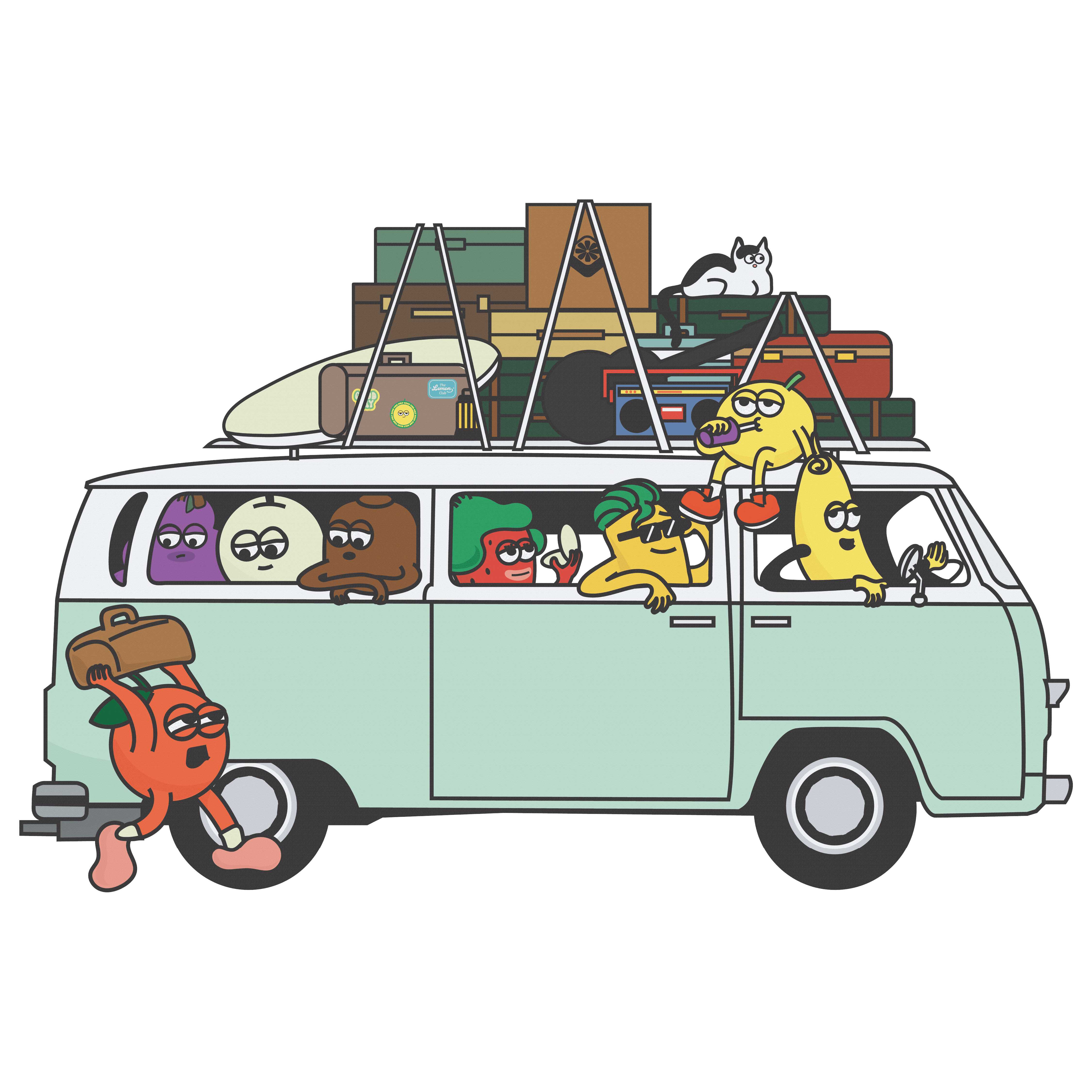 I imagined a sunny road trip where each fruit had its own personality confident, lazy, sassy, or cool all packed into one lemon-yellow van heading for somewhere fun.
