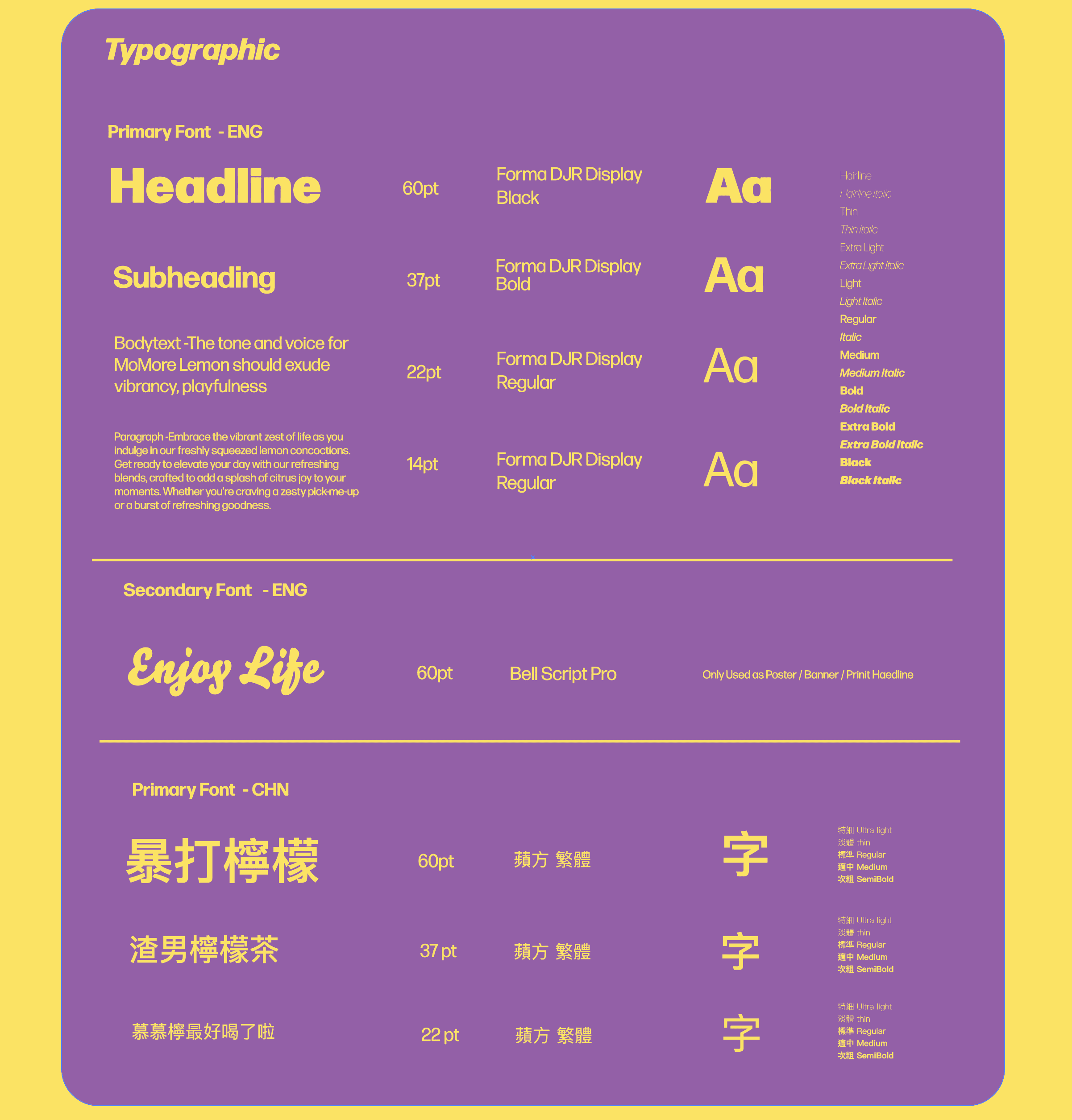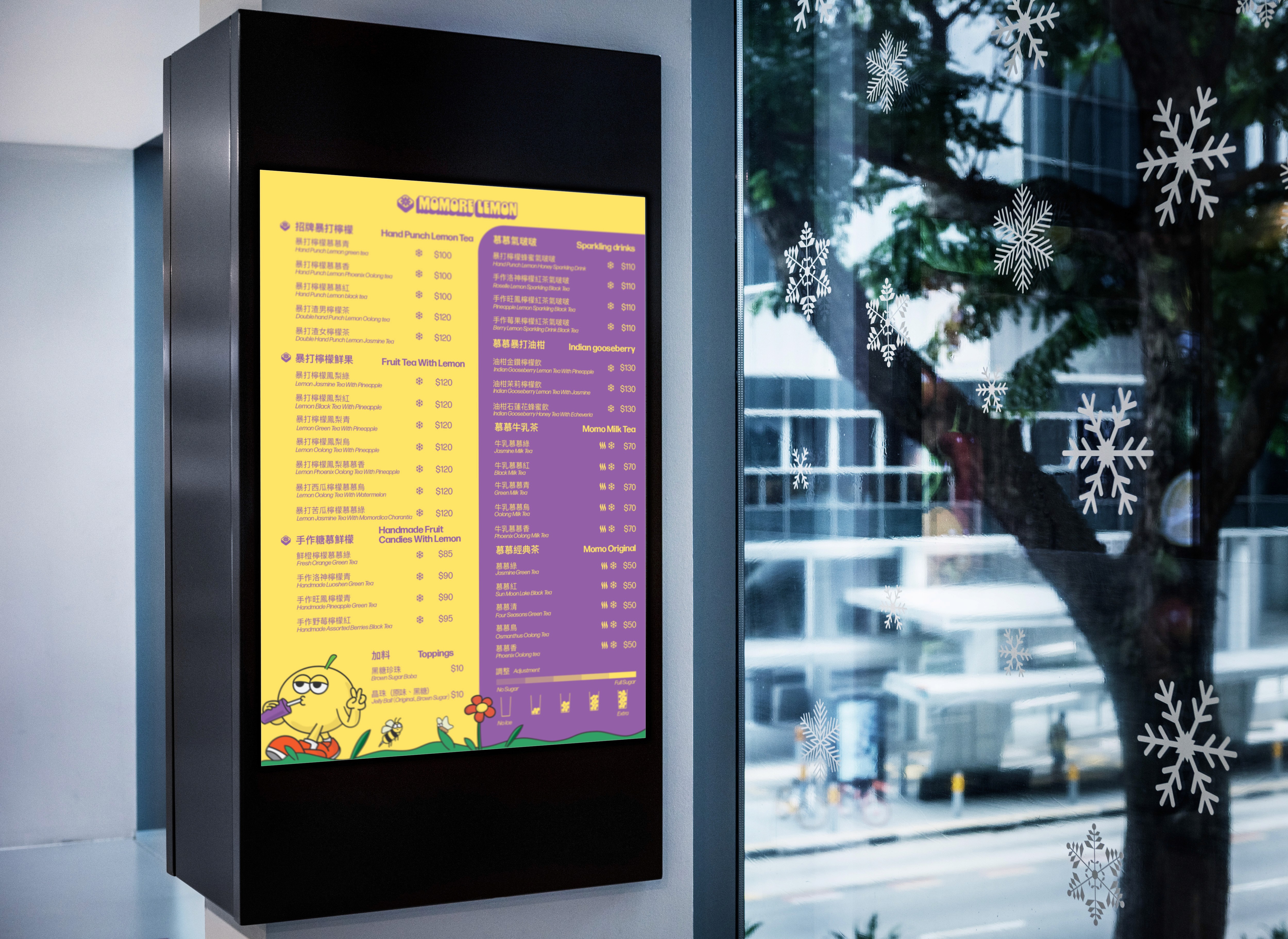 A playful branding and illustration project created for MoMore Lemon, a lemon based beverage brand. The goal was to build a vivid and memorable identity that captures the refreshing, youthful, and slightly irreverent personality of the brand. From logotype and character creation to packaging and menu design, every element was designed to evoke energy, positivity, and fun