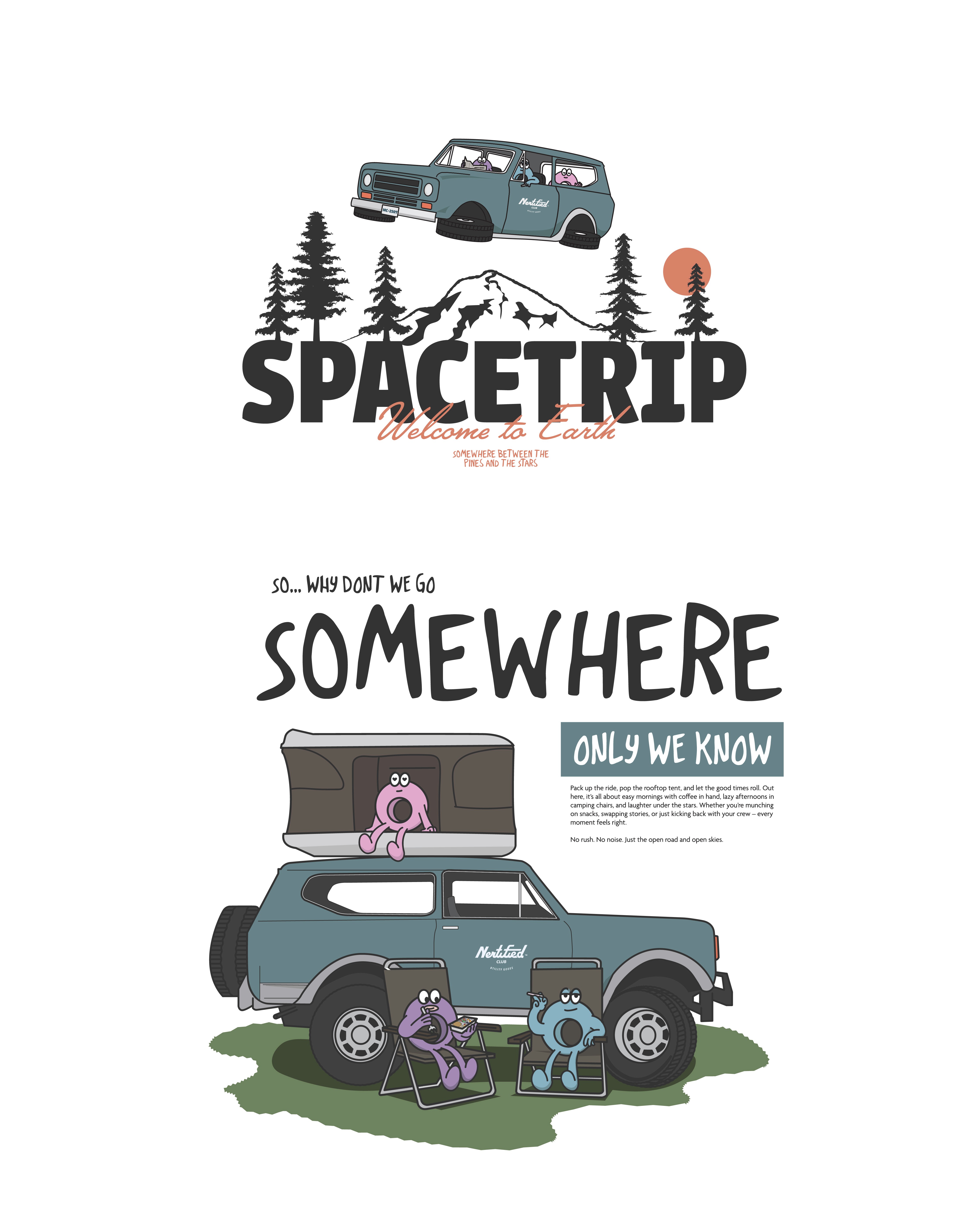 SPACETRIP 是 Nertified 宇宙中的懷舊露營篇章,描繪一群首次抵達地球的奴比,體驗人類休閒活動的故事。 整體以 70 年代戶外旅遊海報為靈感,融合復古的露營風格與外星式幽默,以異星的視角重構人類「放鬆」的概念。 SPACETRIP is a nostalgic, camping-inspired collection from the Nertified universe a story of the Nuppi crew landing on Earth to experience human leisure for the first time. Blending 70s travel poster aesthetics, retro outdoor gear, and absurd alien humor, the project reimagines camping as seen through extraterrestrial curiosity.