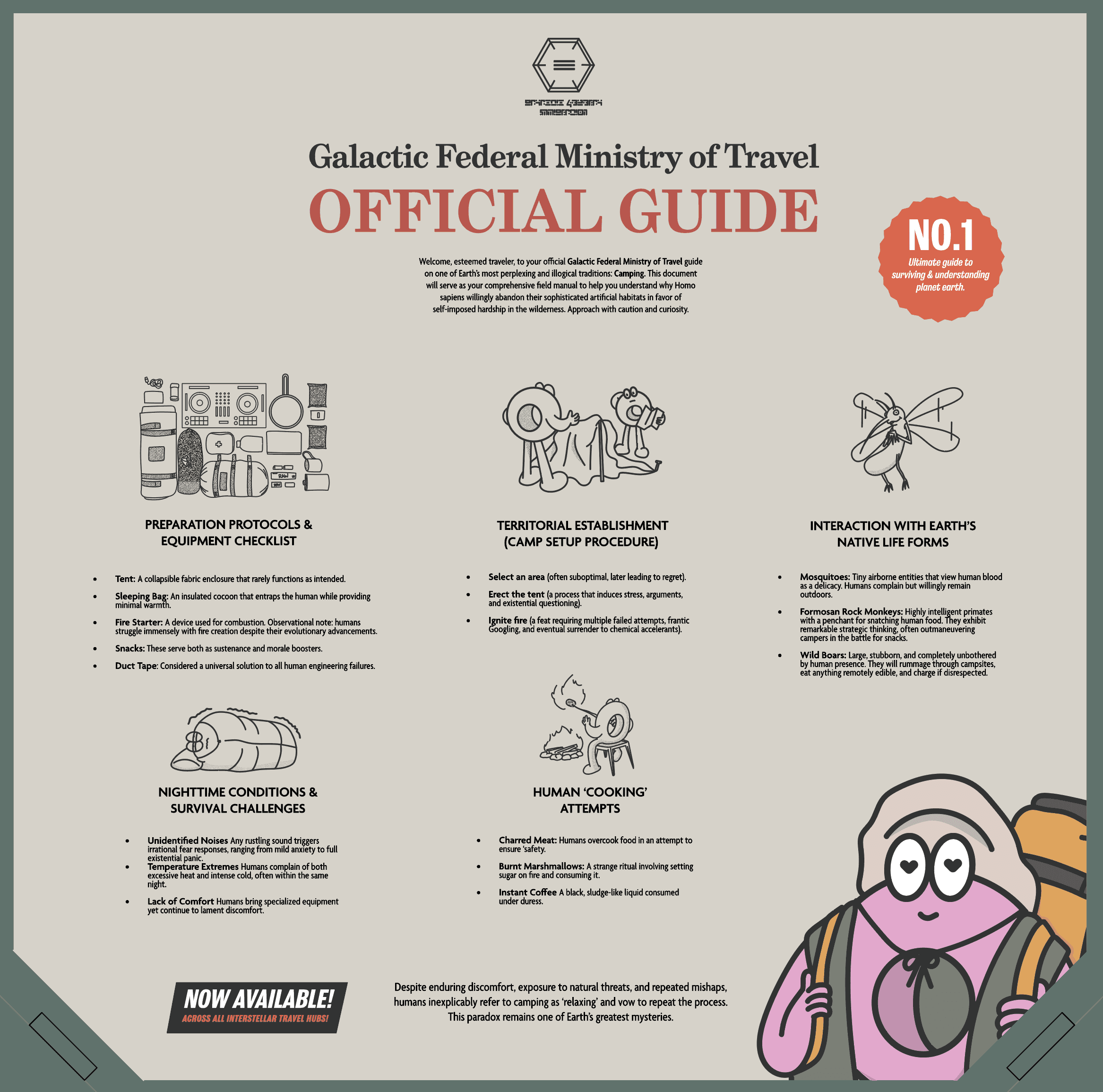 They study Earth’s “Ministry of Travel” handbook, documenting everything from “mosquito defense protocols” to “charred-meat rituals.”