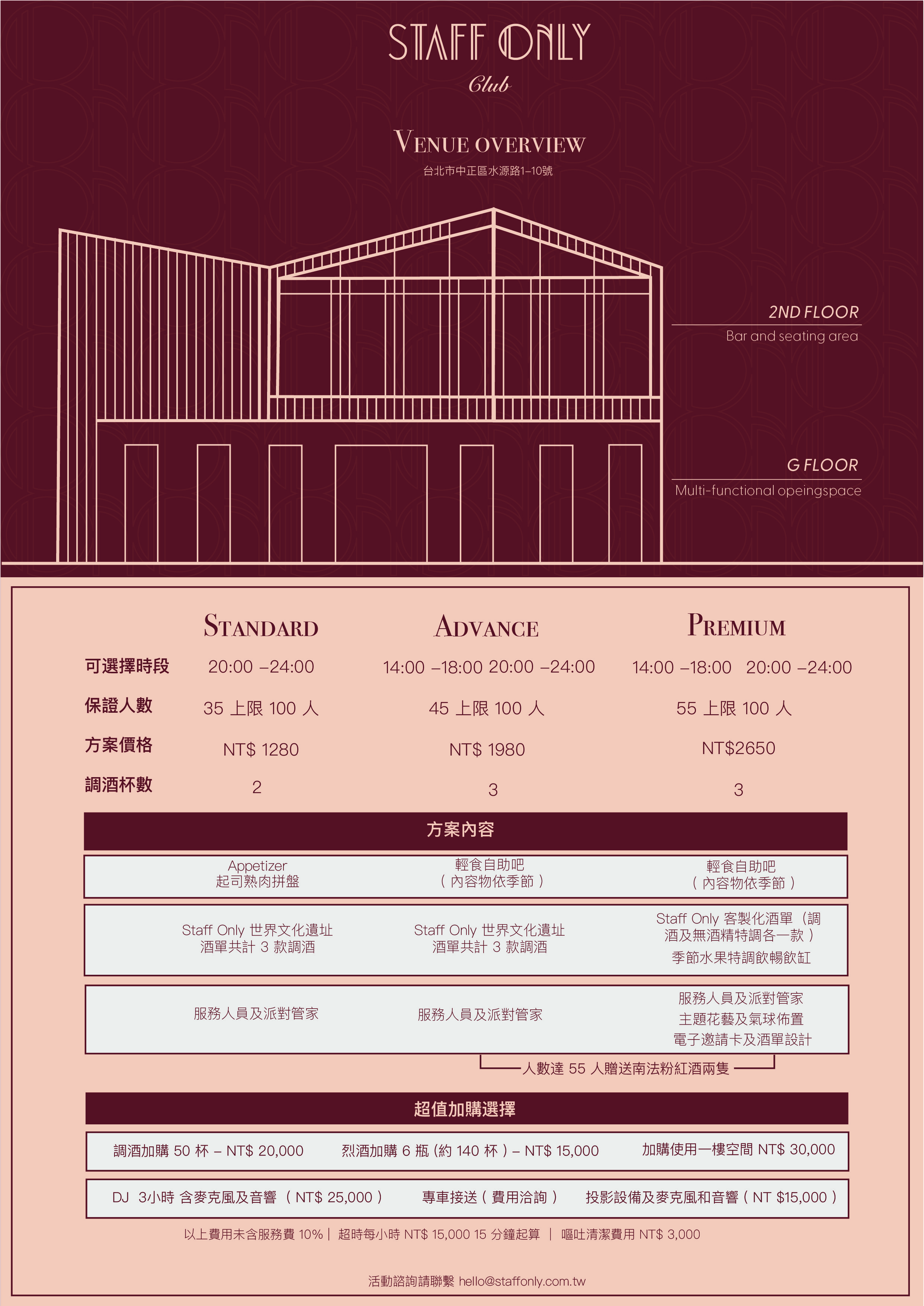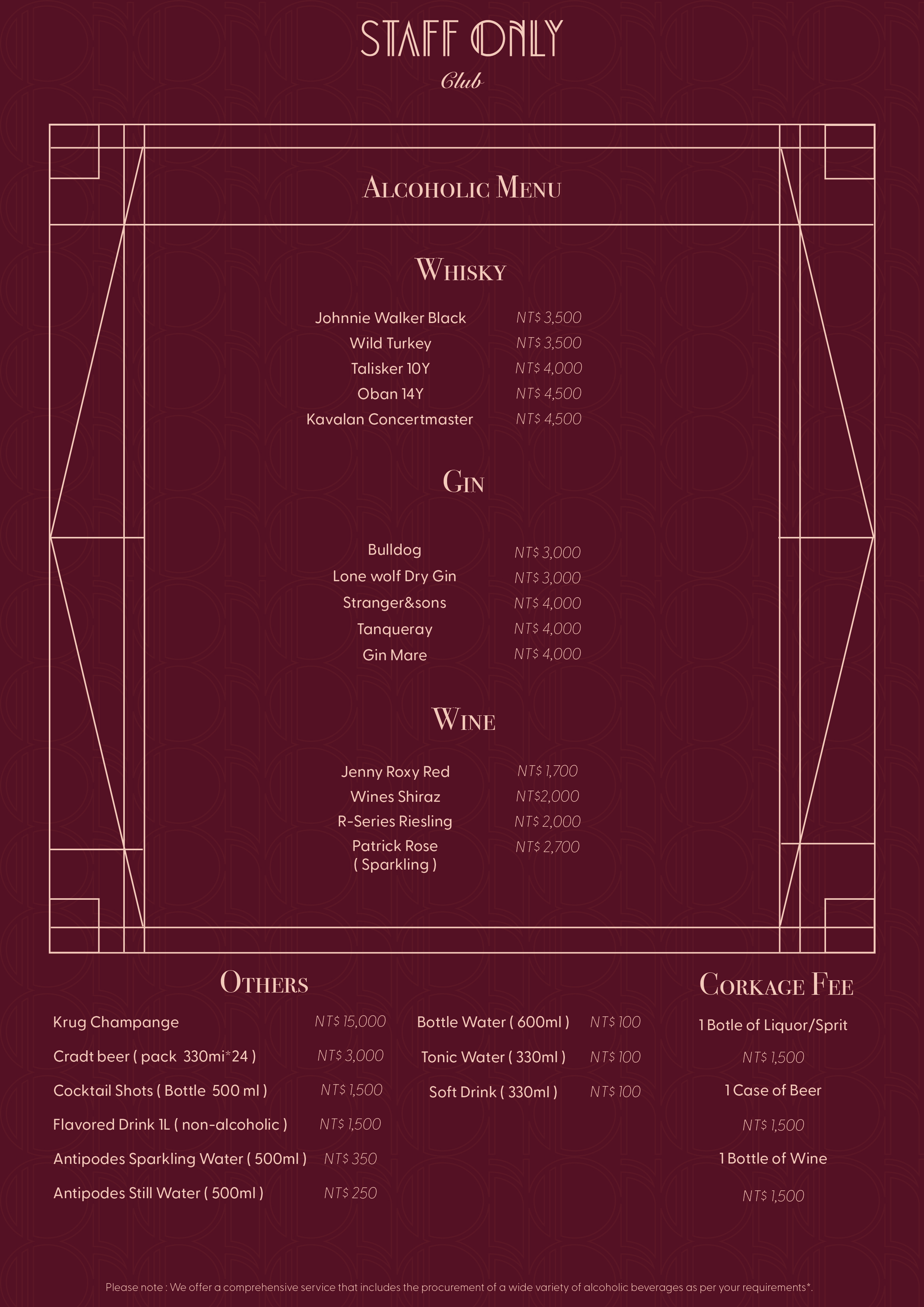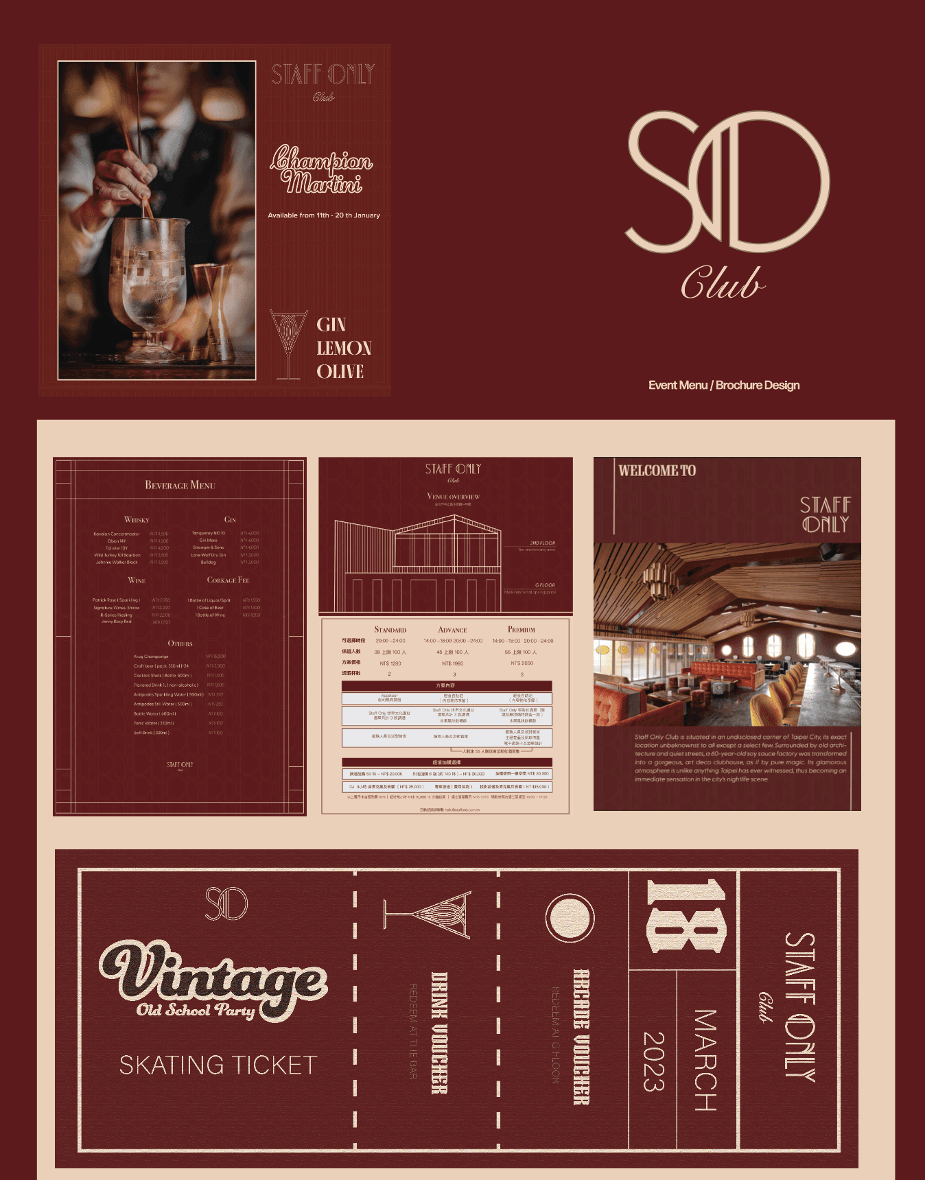 Staff Only Club 是台北最具代表性的酒吧之一,由老工廠改造而成,以 Art Deco 為靈感,結合中世紀的懷舊氣質與現代私密氛圍。空間在「自由與限制」之間找到平衡 從黃銅燈具、磨石吧台到鏡面天花與低光氛圍,每個細節都營造出戲劇性與神秘感,讓整體體驗宛如一場夜色中的電影。