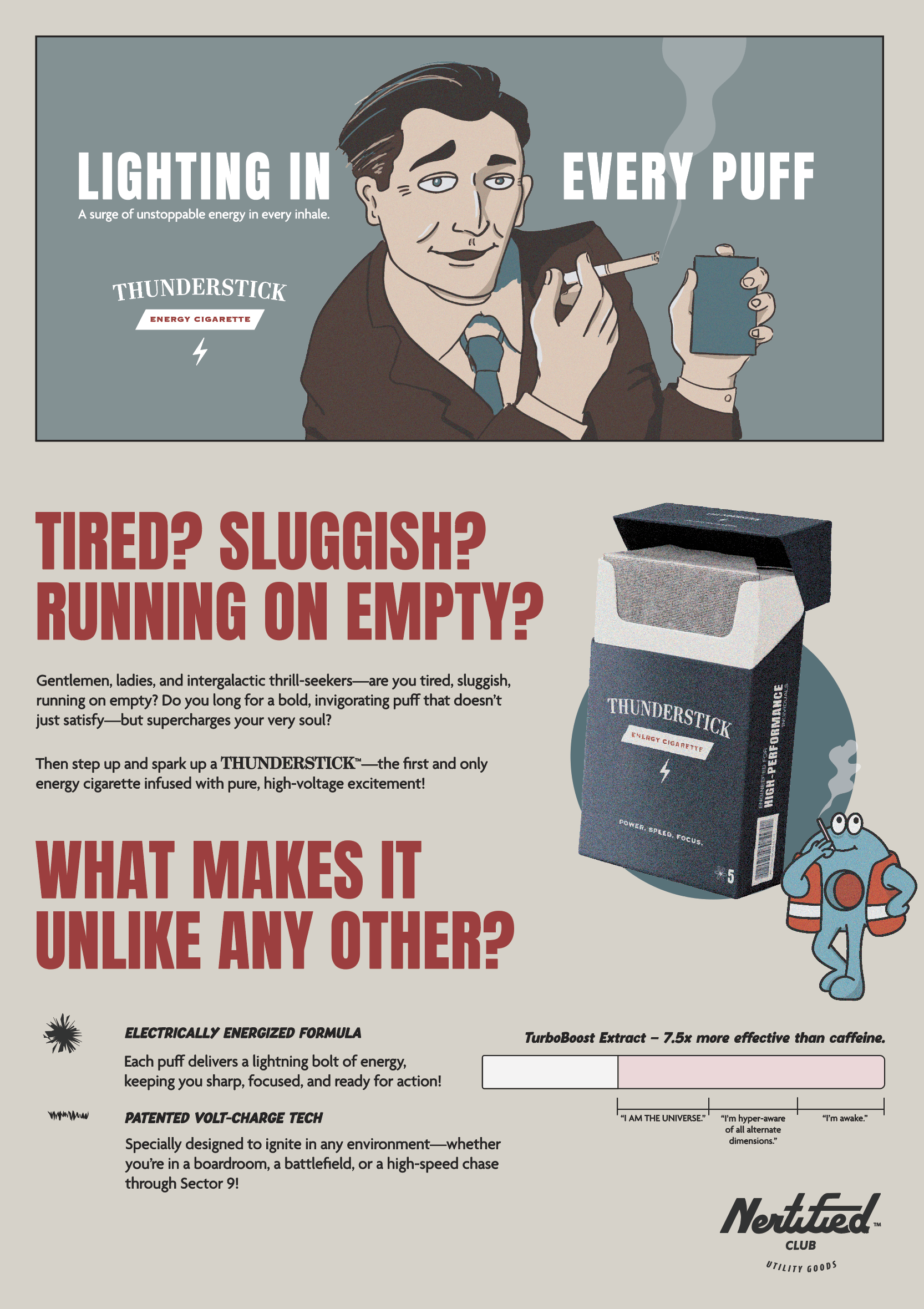 A fictional energy cigarette brand developed within the Nuppi – Exile From the Stars universe. Produced under the control of the human corporation Revelcore Industries, Thunderstick symbolizes the exploitation of alien labor and the commercialization of addiction. 這是一款誕生於《Nuppi – Exile From the Stars》宇宙中的虛構能量香煙品牌。 在人類企業 Revelcore Industries 的掌控下,Thunderstick 成為外星勞工被迫生產的象徵,也代表著對成癮與資本剝削的黑色諷刺。